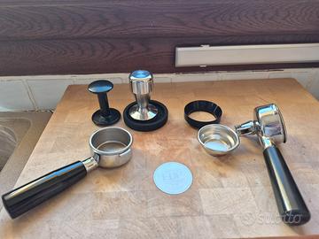 oltre al braccetto doppio originale comprende : braccetto senza fondo + pressino acciaio + imbutto dosatore magnetico + disco copri filtro .
