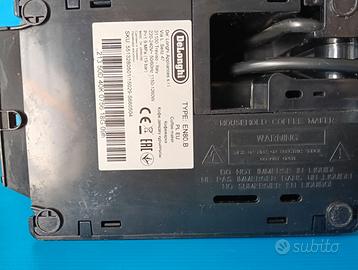 Macchina caffè Nespresso Delonghi EN-80B nera, per ricambi. Azionando il tasto di alimentazione la macchina va in funzione ma perde acqua. Come da foto è priva del serbatoio dell'acqua e del gruppo anteriore raccogli-capsule e poggia-tazza.