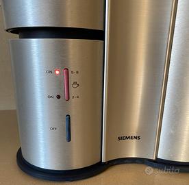 Vendo splendida macchina caffe’ Siemens modello TC91100. Macchina caffè prodotta dalla tedesca Siemens e progettata da F.A.Porsche Design. Acquistata personalmente in Germania nel 1999. Macchina caffe’ con caraffa filtrante, dotata di un thermos in un involucro metallico robusto e di qualità per 8 tazze, con selettore per 2 capacità, filtro rimovibile e basculante. Ottime condizioni, presenti solo alcuni leggeri segni sul manico visibili in foto, perfettamemente pulita e funzionante.