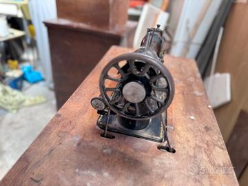 Marca: Vigorelli, un nome celebre nel panorama meccanico italiano del dopoguerra (Pavia). Modello: Si tratta di un modello degli anni '50 o '60, caratterizzato da un design bombato e "aerodinamico" tipico di quell'epoca. Dalle manopole frontali, sembra essere una macchina capace di eseguire diversi punti, incluso il punto zig-zag (indicato dai simboli sulle manopole dorate). Colore: Un classico grigio chiaro/beige opaco con scritte nere. Comandi: Sulla parte superiore si nota il selettore per la larghezza del punto (scala 0-5). Le due manopole frontali servono probabilmente per la selezione dei ricami o la lunghezza del punto. In basso a destra è visibile la leva per la retromarcia (contrassegnata con la lettera "R"). Stato di conservazione: La macchina appare impolverata, segno di un lungo periodo di inutilizzo in un ambiente di deposito (garage o soffitta), ma la struttura sembra integra e priva di ruggine profonda visibile. 2. Il Mobile e la Struttura Mobile: È realizzato in legno con una finitura lucida color ciliegio/noce. Il piano è di tipo a ribalta: quando è aperto, offre una superficie di lavoro più ampia; quando è chiuso, la macchina viene "nascosta" all'interno, trasformando il mobile in una sorta di stipo o scrivania. Meccanismo a pedale: Nell'ultima immagine si vede l'interno del mobile con la cinghia di trasmissione in cuoio ancora collegata. Questo suggerisce che la macchina possa essere utilizzata manualmente tramite un pedale meccanico (posto solitamente alla base, non visibile chiaramente) o tramite un motore elettrico (si nota un ingresso per la spina elettrica sul retro della macchina in una delle foto). 3. Dettagli Tecnici (Foto Sottostante) Una delle immagini inquadra la parte inferiore della macchina (il "sottoscocca"), rivelando i cinematismi in metallo ben lubrificati in passato. È visibile l'albero di trasmissione che muove il crochet e il trasporto del tessuto.