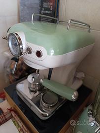 Macchina per caffè espresso dal design elegante e raffinato, in perfetto stile vintage, arricchita dai preziosi dettagli pastello con finiture in metallo. Con i suoi 850W di potenza, 15 bar di pressione, portafiltro per cialda e polvere (1 e 2 tazze), vassoio e contenitore acqua estraibili, la macchina per espresso, ma anche macchina da caffè e da cappuccino permette di gustare a casa caffè e cappuccini cremosi e intensi come quelli del bar. Macchina da caffè espresso Vintage è anche macchina caffè per cialde, amiche dell'ambiente.