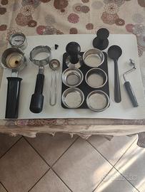 con filtri professionali e filtro cieco per pulizia gruppo erogatore. Pressino Motta da 58 mm e misurino Tescoma in acciaio. Manometro per misurazione pressione in bar e tappetino in gomma. Scatola originale.