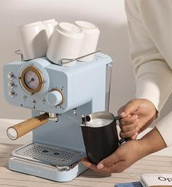 CREATE / THERA MATT RETRO/Caffettiera Express Blu Opaco e Legno/Caffè macinato e cialde E.S.E. 55 mm, caffettiera semiautomatica con pompa di pressione da 15 bar e potenza 1100 W, finitura opaca