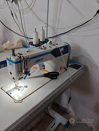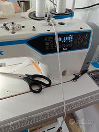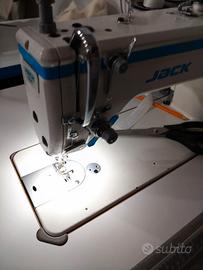 Jack A5E Lineare computerizzata con ampio spazio sottobraccio e controllo digitale della lunghezza del punto controllata da motorino passo passo, con rasafilo automatico, alzapiedino, fermatura digitale silenziosa e taglio del filo corto. Bacinella olio attaccata.
