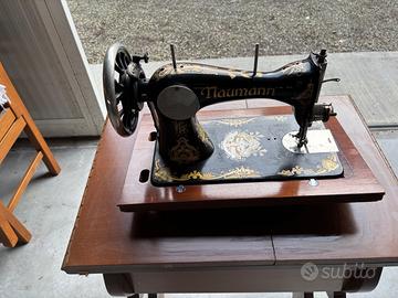 macchina da cucire d'epoca marchio NAUMANN struttura in metallo con decorazioni in metallo dorate senza mobile