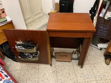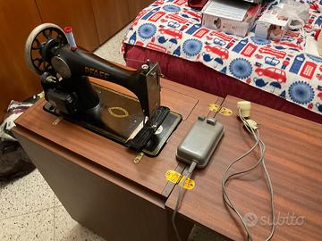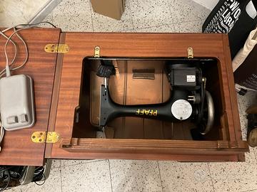 Antica macchina da cucire Pfaff. Il modello dovrebbe essere risalente agli anni anni '30-'50. È montata su un mobiletto, di anni piu recenti probabilmente anni 70 E’ provvista di un motore elettrico esterno aggiunto, la macchia e funzionante.