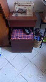 Si trova su un mobile in legno, che funge anche da contenitore o supporto per la macchina stessa. Sotto il mobile è visibile uno sgabello o una seduta imbottita a quadri.