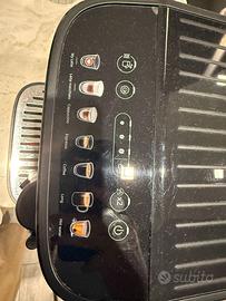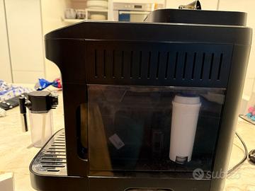 Macchina automatica per caffè in chicchi con vari programmi. Dotata di apposito dispositivo per bevande a base di latte e di erogatore per acqua calda. La macchina è in ottime condizioni, gli unici difetti sono sul piatto di acciaio che risulta un po graffiato (vedi foto)