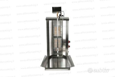 Macchina per kebab professionale dotata di due bruciatori. Struttura in acciaio inox adatto ad alimenti. Motore rotante e bruciatori radianti. Sistema automatico di sicurezza per il blocco del gas. Disponibili varie misure. Cell: 3202314412 Specifiche tecniche: Alimentazione: metano-gpl Capacità: 20 kg Potenza: 6,5 kW Bruciatori: n°2 Dimensioni prodotto:47x64x93 cm