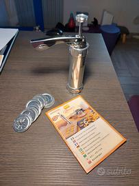 Marcato Biscuits è una simpatica e utile macchinetta con la quale, cambiando le trafile in dotazione, si possono preparare direttamente sulla placca da forno venti tipi di biscotti dalle forme più originali. Costruita in puro alluminio, per garantire una lunga durata, è stata completamente rinnovata nel design e nella funzionalità. E' incluso nella confezione un libretto di 12 pagine con foto a colori, istruzioni dettagliate in diverse lingue e alcune ricette.