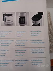 pratica macchina per caffè americano ( orziera) dotato di caraffa in vetro per 10 tazze, sistema antigoccia e indicatore livello di riempimento e assenza di acqua. Accessori lavabili in lavastoviglie.