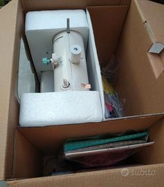 Accessori inclusi (tessuti e cartamodelli, forbici da cucito, forbici zig zag, metro a nastro, 2 spolette in metallo, 2 rocchetti di filo bianco e nero, scatola con spille colorate, infilaago, pedale, alimentatore di rete, manuale di istruzioni, scatola originale, ecc.)