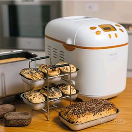 La Forneria di Imetec è la nuova macchina del pane pensata per gli amanti del pane italiano fatto in casa buono, fragrante e croccante. Grazie alla tecnologia innovativa, ai programmi automatici e ai numerosi accessori si possono creare tanti tipi di pane, ciabatte e panini croccanti e fragranti per ogni gusto, scegliendo tra diverse tipologie di farine: farina 00, farro, orzo, integrale, multi-cereali e con semi. La Forneria di Imetec è semplice da utilizzare: inserisci gli ingredienti, imposti il programma e la macchina impasta, lievita e cuoce alla perfezione grazie al doppio livello di cottura. È possibile programmare l’avvio della macchina per svegliarsi ogni mattina con il profumo del pane appena sfornato caldo, fragrante e croccante. La Forneria di Imetec ha una temperatura controllata di lievitazione ideale per il pane e la pizza sia con lievito di birra che con lievito madre. Infine è adatta anche per la preparazione di deliziosi plumcake e marmellate. Nella confezione è incluso il ricettario. Programmi per produzione di pane e pasta 20 programmi automatici per pane con farine 00, farro, orzo, integrali, multi-cereali e con semi; dolci; impasto e lievitazione pizza; marmellate. - Contenitore per pane fino a 1 Kg - 2 contenitori per cuocere 2 ciabatte - 2 contenitori per cuocere 6 panini. - Cestello porta stampi con maniglie di silicone - Bicchiere graduato da 450 ml - Misurino per lievito da 1,5 a 11 g. Caratteristiche Display incorporato Sì Partenza differita Sì Finestra visuale Sì Colore del prodotto Ocra, Bianco Preparazione confettura Sì Massimo peso del pane 1 kg Controllo di doratura della crosta variabile Sì Quantità programmi automatici 20 Funzione mantieni al caldo Sì peso minimo pane 80 g Livelli di doratura della crosta variabili Scuro, Chiaro, Medio Partenza ritardata 15 h Rivestitura anti-aderente Sì Tipo di controllo Pulsanti Numero di programmi 20 Livelli doratura 3 Coperchio rimovibile Sì Lunghezza cavo 1 m.