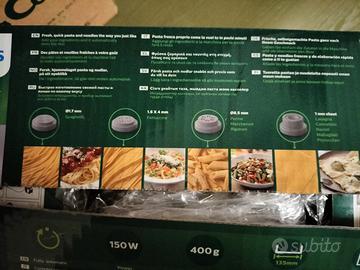 Macchina Philips Pasta Maker per preparare la pasta fresca a casa. Praticamente nuova,usata solo 3/4 volte. Dotata di 4 trafile: una per spaghetti,una per fettuccine,una per penne, maccheroni e rigatoni e una per lasagne, cannelloni, maltagliati, pizzoccheri e ravioli. Con accessori per la pulizia e istruzioni anche in italiano. Semplicissima da usare.