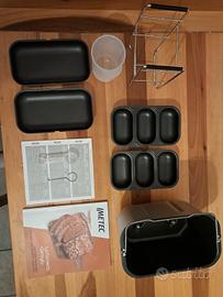 Imetec semi nuova con 10 programmi anche per farine gluten free. E' completa di tutti gli accessori ( bicchiere per misurare, altro misurino, gancio per pale mescolatrici, libretto istruzioni e ricette, 3 contenitori per forme di pane oltre al cestello per pane a cassetta). In ottimo stato con scatola esterna