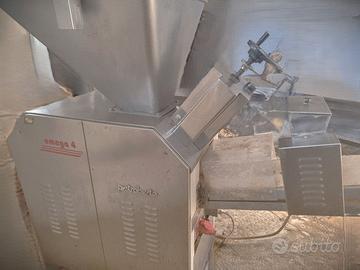 Spezzatrice con sistema idraulico OMEGA 4. Caratteristica principale di queste macchine è la completa assenza di sistemi di lubrificazione e quindi risparmio di olio e di manutenzione. Particolari materiali e soluzioni tecniche permettono questo importante risultato. E’ possibile spezzare impasti lievitati avendo la possibilità di gestire la pressione di spinta dell’impasto sul cassetto di peso da un minimo di 35 a 60 atm, agendo sul sistema idraulico. Ampia possibilità di grammature. È realizzabile nella versione con scarico frontale oppure con scarico laterale (a sinistra oppure a destra), entrambi regolabili in altezza (max 90 cm). Tramoggia in acciaio inox capacità 150 kg e sfarinatore automatico in dotazione. Su richiesta tramogge maggiorate.