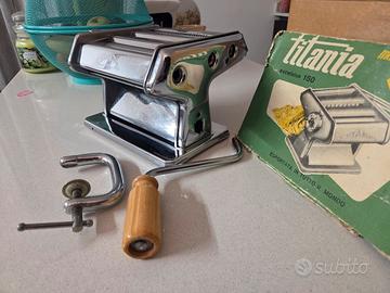 Macchina per tirare la sfoglia, fare tagliatelle e spaghetti, marca Titania tipo Excelsus 150 prototta in completamente italia e in acciai INOX e completa di manovella e morsetto di bloccaggio.