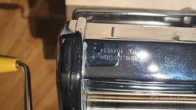 Macchina in Acciaio Inox con blocco per lavorare fettuccine,tagliatelle,lasagne e agnolotti. Regolazione per 6 spessori di lavorazione. Dotata di motore elettrico, intercambiabile all'uso manuale, pulsanti per 2 velocità e intermittenza per ravioli, manovella per utilizzo a mano e morsetto di fissaggio. Altri accessori: rotelle manico di legno per taglio della pasta, stampo a tavoletta per ravioli.