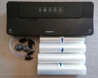 Macchina sigilla sacchetti, usata poco, sottovuoto preciso, tre rotoli e mezzo di 300 mm c/u, compreso nel prezzo, marca Silver Crest. Nessun problema o difetto.
