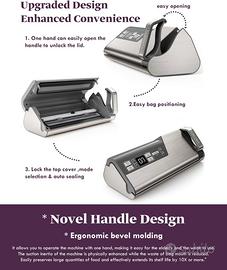 Display digitale a LED e manico bloccato con una sola mano: Quando i sacchetti di impermeabilizzazione a vuoto, lo schermo LED digitale sarà conteggiato e mostrerà per quanto tempo il processo sarà completato. Un’operazione di maniglia a chiave di una mano permette di bloccare facilmente il coperchio con una semplice rotazione. Fornire a tutti gli utenti un’esperienza di facile impiego. Nota: non chiudere il coperchio durante la conservazione.