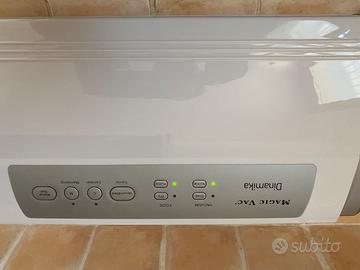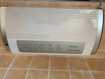 Splendida macchina professionale sottovuoto usata pochissimo, valore del nuovo € 169,90 sullo store MagicVac, €105/130 (siti UniEuro, Euronics ecc.), tastiera impermeabile multifunzione, doppia impostazione per cibi secchi o umidi, ciclo completamente automatico con pulsante retroilluminato a luce blu, ciclo manuale con pulsante saldatura istantanea per cibi fragili e delicati retroilluminato a luce rossa, vano portarotoli con taglia sacchetti bidirezionale integrato.