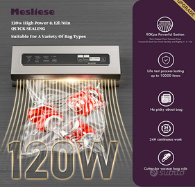 【Potente Aspirazione Testata a 90 kPa】Il sigillante sottovuoto Mesliese supporta 20 sigillature continue con una potenza di 120 W. Il motore robusto fornisce un'aspirazione reale di 90 kPa, aspirando il cibo più saldamente rispetto alle normali macchine. Tempo di aspirazione da 3 a 10 secondi, tempo di sigillatura da 9 a 12 secondi. Ti permette di conservare i tuoi alimenti senza problemi.