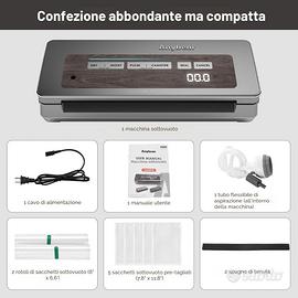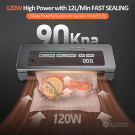Sigillatrice sottovuoto potente e completa, ideale per la conservazione degli alimenti. Offre modalità secco/umido, funzione impulso, sigillatura a caldo extra larga da 5 mm, display digitale con conto alla rovescia e taglierina integrata con alloggio per rotoli. Aspirazione fino a 90 kPa (100W) per una sigillatura rapida ed efficace. Esegue il sottovuoto anche dei barattoli e contenitori. Completa di manuale, tubo di aspirazione per i barattoli ed inclusi sacchetti e rotoli senza BPA. Ottima soluzione sia per uso domestico che professionale. Prezzo di listino 139 €, NUOVA MAI USATA. Vendo causa inutilizzo