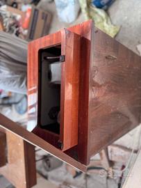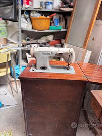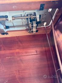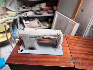 Marca: Vigorelli, un nome celebre nel panorama meccanico italiano del dopoguerra (Pavia). Modello: Si tratta di un modello degli anni '50 o '60, caratterizzato da un design bombato e "aerodinamico" tipico di quell'epoca. Dalle manopole frontali, sembra essere una macchina capace di eseguire diversi punti, incluso il punto zig-zag (indicato dai simboli sulle manopole dorate). Colore: Un classico grigio chiaro/beige opaco con scritte nere. Comandi: Sulla parte superiore si nota il selettore per la larghezza del punto (scala 0-5). Le due manopole frontali servono probabilmente per la selezione dei ricami o la lunghezza del punto. In basso a destra è visibile la leva per la retromarcia (contrassegnata con la lettera "R"). Mobile: È realizzato in legno con una finitura lucida color ciliegio/noce. Il piano è di tipo a ribalta: quando è aperto, offre una superficie di lavoro più ampia; quando è chiuso, la macchina viene "nascosta" all'interno, trasformando il mobile in una sorta di stipo o scrivania. Meccanismo a pedale: Nell'ultima immagine si vede l'interno del mobile con la cinghia di trasmissione in cuoio ancora collegata. Questo suggerisce che la macchina possa essere utilizzata manualmente tramite un pedale meccanico (posto solitamente alla base, non visibile chiaramente) o tramite un motore elettrico (si nota un ingresso per la spina elettrica sul retro della macchina in una delle foto).