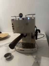 macchinetta del caffè Icona Vintage DeLonghi utilizzabile con caffè in polvere, munita di dispositivo che miscela vapore per il cappuccino. Piccolo difetto: serbatoio dell’acqua scheggiato, ma facilmente risolto con nastro impermeabile. Prezzo originale: 254€