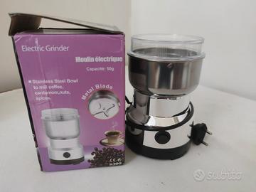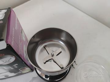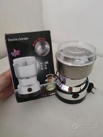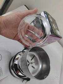 Macinacaffè elettrico con lama in metallo e ciotola in acciaio inmacinacaffè elettrico portatile, ideale per macinare chicchi di caffè, spezie e noci direttamente a casa. Potenza: Il motore ha una potenza di 200W. Materiali: Dotato di lame in acciaio super affilate e una ciotola in acciaio inossidabile. Capacità: Progettato per macinature rapide di piccole quantità. Funzionamento: Utilizza un sistema di attivazione one-touch premendo il coperchio trasparente.ossidabile. - Potenza: 200W - Ciotola in acciaio inossidabile - Lama in acciaio inox super affilate - Design compatto