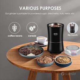Macinacaffè Elettrico 200W Lame in Acciaio Inox •Lame in acciaio inox di alta qualità – garantiscono una macinazione uniforme del caffè ad ogni macinazione. •Funzionamento con un solo pulsante: riempire il contenitore con chicchi di caffè, inserire il dispositivo in una presa di corrente e premere il pulsante per 8-25 secondi. •Soddisfa una varietà di esigenze di caffè: basta impostare la durata della macinatura per macinare individualmente il tuo macinato. •Facile e veloce da pulire: il contenitore per macinatura può essere facilmente strofinato con una piccola spazzola e la ciotola può anche essere pulita con un panno umido. •Facile da riporre: il macinino compatto per caffè e spezie può essere facilmente riposto in armadi e cassetti, in modo che non sia necessario acquistare un macinino elettrico aggiuntivo e non c'è bisogno di spazio sul bancone.