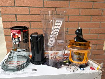 Incluso nella vendita: estrattore, tutti gli accessori originali, due contenitori, cestello in acciaio, tappo antisgocciolo, manuale e imballo originale.