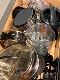 Completo di tutti gli accessori originali, incluso il cestello vapore XXL per cucinare grandi quantità o più pietanze insieme.