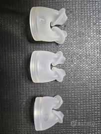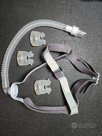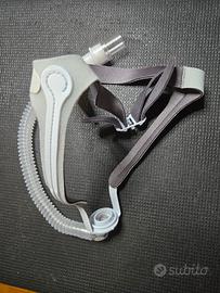 Maschera CPAP Respireo Primo P, a cuscinetti nasali, con 3 cuscinetti in silicone taglia S, M, L. Ottime condizioni, manca l'anello per fissare il tubo in cima alla testa (ovviamente può essere sempre usata con il tubo orientato in altra direzione). Giunto sferico con tubo morbido di raccordo.