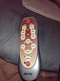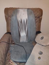 Massaggiatore schiena fino alla parte della seduta. Dotato di cuscinetto removibile, testine massaggianti rotanti, fasce di fissaggio per qualsiasi sedia/poltrona, alimentatore, comando e tasca per custodia comando. Tramite comando si attiva il calore durante il massaggio, che può essere: