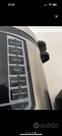 Elettrodomestico con varie funzioni di cottura (vapore, lenta cottura ecc..) corredato da coperchio per friggitrice ad aria e pentola a pressione. Completo di scatola originale