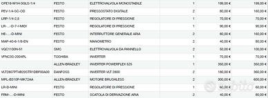 Vendo articoli nuovi per automazione automatismi industriale e civile: sensore induttivo, attuatore, fotocellula a forcella - t/r - subacquea - a riflessione - tonda dritta - a 90 gradi, misuratore laser, micro magnetico di sicurezza, finecorsa di sicurezza, micro meccanico, cilindro pneumatico, slitta pneumatica, attuatore rotante, pinza pneumatica, elettrovalvola monostabile e bistabile, elettrovalvola da pannello, pressostato digitale, regolatore di pressione, interruttore generale aria, manometro, inverter, inverter powerflex 525, inverter VLT 2800 VLT2800, motore brushless, scatola di derivazione dell'aria. Sia ritiro a mano che spedizione, con fattura. Contattatemi per chiamata, messaggio o email. Grazie. Codici: WF80-40B416 WF50-40B416 E3Z-T86A-D E3Z-T86A-L WF120-40B416 WTF12-3P2431 WTB4S-3P2262V WLG4S-3K2232 WL9L-3P2232 WTB9-3P2261 WL9L-3P2432 WT9-2P441 WT9L-P430 WL9G-3P2432 WL9-3P2430 WL12G-3B2531 WT12-2P450 WTB12-3P2411 WT12-2P440 VL18L-4P344 VL18-4P3440 VL18-4P3340 VTF18-4P5440 LW86PA3 XW100PA3 OGT500 LR-ZB250AP E3F2-DS30B4 440N-Z2D1SS2H 440P-CSLS11B 050F02 SZ4127.010 IFS204 IFS205 IFS212 IE5257 E2A-M18KS08-M1-B1 BES516-325-E5-C-S4 E2A-M18LS08-M1-B1 IGC204 E2A-M12KN08-M1-B1 E2A-S08LN04-M1-B1 E2A-S08LS02-M1-B1 IM12-02BPS-ZC1 DSNU-32-12-P-A-R3 DSNU-25-25-P-A DSNU-25-50-PPV-A DSNU-16-25-PPV-A DSNU-16-50-PPV-A DSNU-25-25-PPV-A DSNU-25-125-PPV-A DSNU-16-200-P-A DFM-20-40-P-A-KF ADN-16-20-A-P-A AEN-16-20-I-P-A-Z-Q C85N20-50 CD85N25-10-B MXQ16-50ZD-X27 MSQB10L2 MSQB7A MHZL2-25D DFM-25-80-P-A-KF 60M2L100A0300 VUVG-L18-M52-RT-G14-1P3 CPE18-M1H-5J-1/4 MHE4-MS1H-3/2G-1/4 CPE10-M1H-5J-M5 VUVG-L14-M52-AT-G18-1P3 VUVG-L18-B52-T-G14-1P3 VUVG-L14-T32C-AT-G18-1P3 VUVG-L14-B52-T-G18-1P3 VUVG-L14-P53E-T-G18-1P3 CPE14-M1BH-5L VMPA1-M1H-J-PI CPE14-M1BH CPE18-M1H-3GLS-1/4 PEV-1/4-SC-OD LRP-1/4-2,5 LR-...-D-7-I-MIDI HE-...-D-MINI MAP-40-6-1/8-EN VQC1100N-51 VFNC3S-2004PL INVERTER POWERFLEX 525 VLT2807PT4B20STR1DBF00A00 MPL-B310P-MK72AA LR-D-MINI FRM-...-D-MIN