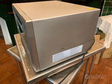 Microonde grigio metallizzato volume 34L piatto interno rotante di diametro 325mm. Vari programmi tra cui Microonde, Grill o Combinato fino a 7 livelli di potenza. Come nuovo, usato molto poco, leggeri graffi sul laterale perchè era inserito in una nicchia (si vedano foto). Vendo per cambio casa e ingobro non sostenibile nella casa nuova. Marca Terrington House con spina a schuko. Misure 54x50x30 cm. Porta con apertura con tasto.