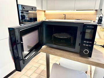 Capacità forno 23 litri , timer 60 minuti , 5 livelli di potenza selezionabili, display LCD , funzione grill e scongelamento. Segnale acustico di fine cottura, potenza microonde 800 W . Potenza grill 1000 W. Dimensione 48x27x39