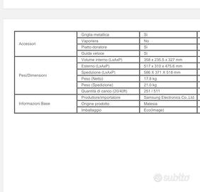 Vendo Microonde Samsung Regalo 2025 del catalogo Esselunga MAI USATO e ANCORA IMBALLATO, causa errate misure prese nella mia cucina. Vedere foto delle caratteristiche del prodotto prese da catalogo Esselunga e scontrino del 23/6/2025 per la garanzia di 2 anni. Prezzo al pubblico dichiarato da Esselunga e presente online di circa 300€.