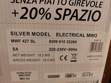 microonde whirpool senza piatto girevole (molto comodo) con molteplici modalità di cucina. per vedere le funzioni e le misure cercare "Whirpool silver model mwf 427 sl" su Google.