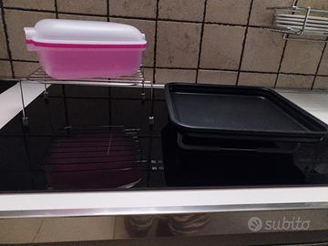 Multifunzione, senza piatto girevole. Provvisto di piatto crisp rettangolare, vaporiera , griglia alta e griglia bassa. Pinza per piatto crisp.