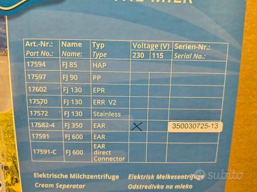 La Milky FJ 350 è una scrematrice a pavimento per uso professionale dall'alta capacità di resa per la lavorazione di elevate quantità di latte fino a 350 litri/ora. La crema viene versata in un contenitore in acciaio inox da 22 litri e il gancio di fissaggio ne impedisce la fuoriuscita. Anche l'erogatore del latte e della panna, il supporto del contenitore e l'alloggiamento sono in acciaio inox AISI 304. Le parti in acciaio inox sono particolarmente igieniche e facili da pulire.