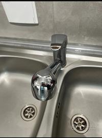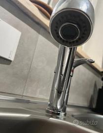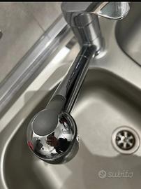 Modello di miscelatore per cucina con canna bassa, doccia estraibile e leva in metallo. Cartuccia a dischi ceramici dm 40 mm. Foro sul lavello dm 35 mm. Aeratore M24x1. Flessibili di alimentazione M10x1 G3/8". Base dm 53 mm. Pressione Min: 1Bar max: 5Bar. Temperatura Min 5°C max 55°C.