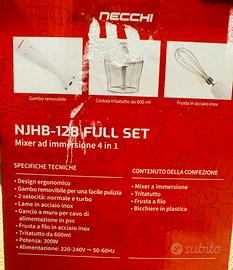 Robottino da cucina tre in uno: sbattitore elettrico, mixer, frullatore a immersione. Nuovo, mai usato. Imballo e accessori originali. Nella scatola aperta per foto. Marca e modello Necchi njhb-128.