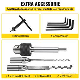 · Accessori Completi: gli accessori di questo prodotto includono un mandrino per trapano da 13 mm, una taglierina per tenoni da 3/8, un supporto per scalpello da 19 mm e quattro chiavi esagonali, offrendo più possibilità per questa macchina per tenoni.