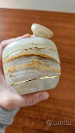 Mortaio con pestello, bianco e oro con venature più scure. È antico, vintage. Altezza 6,5 cm. Diametro superiore 8 cm. Diametro inferiore 6,5 cm. Pestello = 7,5 x 3,5 cm. Purtroppo non conosco il materiale. Difetto= il pestello è scheggiato, anche il mortaio è lievemente scheggiato, tutto è visibile dalle foto. Peso totale= 595 cm. ⚠️se la spedizione ha un costo elevato, scrivimi!