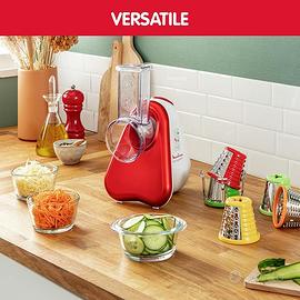 Triturazione fine, triturazione spessa, affettatura sottile, grattugiatura e taglio ondulato. Cono grattugia interamente in metallo per una velocità ancora maggiore