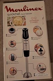 Moulinex DD6578 Frullatore ad immersione 0,8 L 1000 W Nero, Acciaio inossidabile Così tanta potenza, con così poca fatica Con il frullatore ad immersione Quickchef di Moulinex, godi di una potenza ottimale senza alcuna fatica. Prepara facilmente una varietà di piatti in pochissimo tempo grazie a un motore da 1000 W ad alte prestazioni, e mantieni il controllo con le 10 velocità regolabili non stop e un quadro dei comandi intuitivo e facile da usare. Una protezione antischizzi e un’impugnatura antiscivolo forniscono comfort d’uso, mentre le parti lavabili in lavastoviglie assicurano una facile pulizia. Frullatore ad immersione Moulinex Quickchef: un’emulsione sempre potente a portata di mano Potenza ottimale senza fatica! Con il frullatore ad immersione Quickchef di Moulinex, godi di alte prestazioni e controllo totale grazie a un motore da 1000 W e a 10 velocità che possono essere regolate senza arrestare la macchina, mediante un quadro dei comandi intuitivo e facile da usare. Prepara in modo rapido e semplice tanti piatti grazie alle pratiche caratteristiche del frullatore ad immersione, fra cui una protezione antischizzi e un’impugnatura antiscivolo per un maggiore comfort d’uso, e ai componenti lavabili in lavastoviglie per una facile pulizia. A completamento vengono forniti un bicchiere da 800 ml e un tritatutto da 500 ml per sminuzzare facilmente vari ingredienti