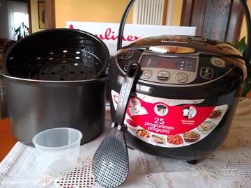 Multicooker Moulinex 25 programmi MAI USATO, imballato nella sua confezione originale. Caratteristiche:cottura al forno, rosolatura, zuppa, stufato, cottura lenta, cottura a vapore, riso, omogeneizzato, sterilizzazione, frittata, dessert, yogurt,marmellata e riscaldamento. L'apparecchio è dotato anche di un timer regolabile e della funzione di avvio ritardato. Capacità lt. 5 Dotato di libro con qualche ricetta